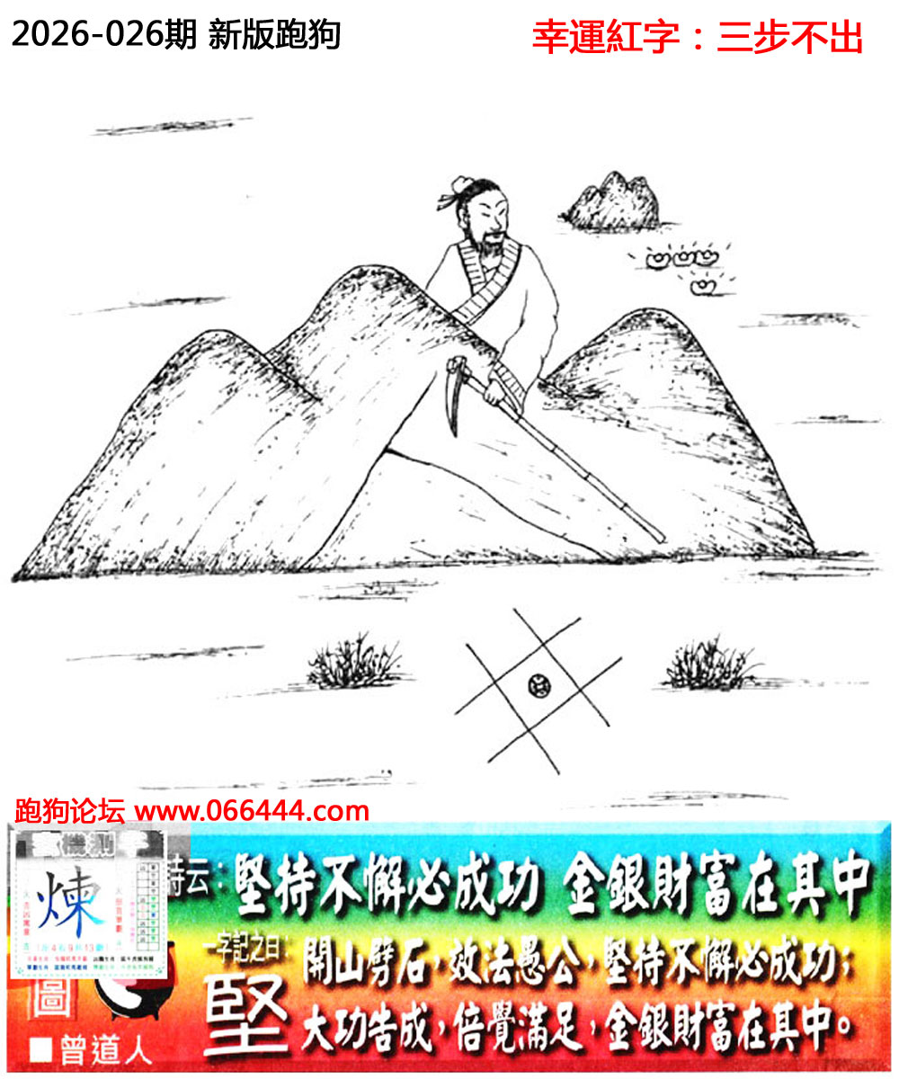 026期老版跑狗一字記之曰:【堅】 詩雲:堅持不懈必成功,金銀財富在其中。 開山劈石,效法愚公,堅持不懈必成功; 大功告成,倍覺滿足,金銀財富在其中。 玄機測字:《煉》