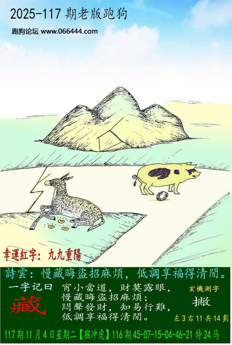 117期老版跑狗一字記之曰:【藏】 詩雲:慢藏晦盜招麻煩,低調享福得清閒。 宵小當道,財莫露眼,慢藏晦盜招麻煩; 悶聲發財,知易行難,低調享福得清閒。 玄機測字:《撇》